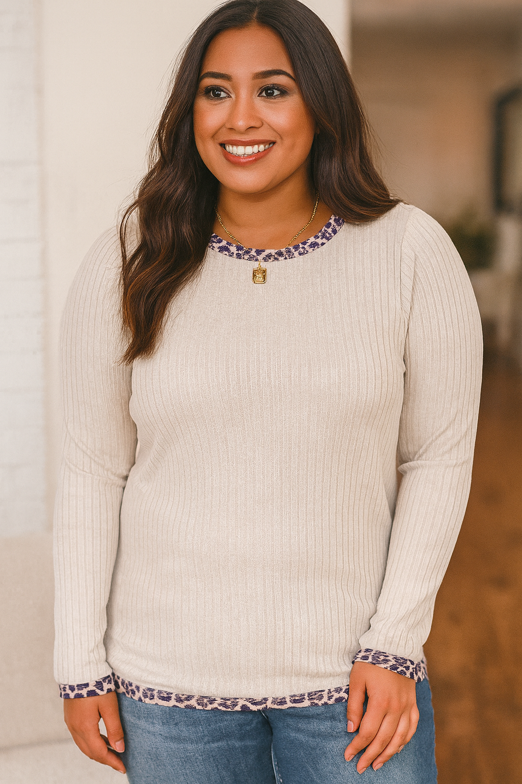 Elevate your wardrobe with the Beige Ribbed Leopard Plus Top FB, combining classic comfort with a bold edge. Crafted from soft, breathable ribbed fabric, this top ensures all-day comfort. The chic leopard trim adds a trendy flair, while the round neck offers versatile styling options. Designed to flatter full-figured curves, this plus-size top highlights your shape with confidence and style.