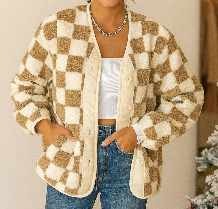 Stay warm and stylish with the Brown Checkered Sherpa Jacket FB. Its soft sherpa fabric provides cozy comfort on chilly days, while the trendy checkered pattern adds a fashionable touch. The buttoned front closure makes layering simple, and the chunky fit offers a relaxed silhouette that complements every body type. Perfect for elevating your cold-weather wardrobe with ease.