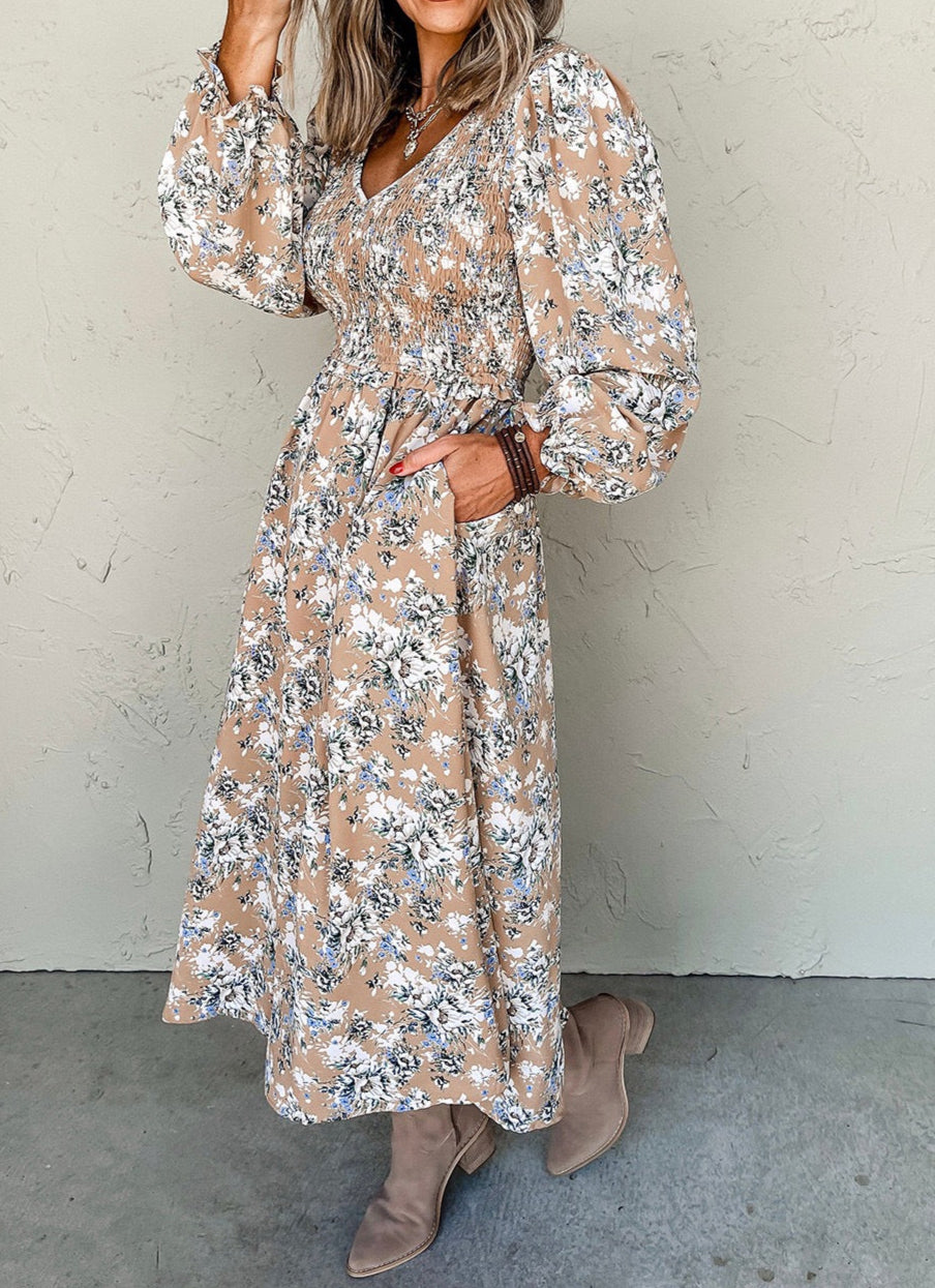 Elevate your style with our Brown Floral Maxi Dress. Enjoy its light brown color adorned with a beautiful blue, black, and white floral pattern. The long puff sleeves add a touch of elegance, while the smocked top and v-neck provide a comfortable and flattering fit. Perfect for any occasion.