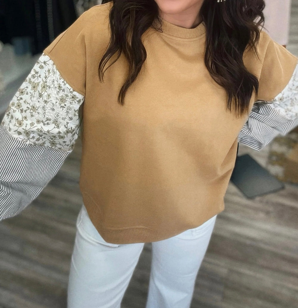 This camel sweatshirt features a playful floral and striped patchwork design that adds trendy flair to any casual outfit. Ruffled sleeves introduce a charming, feminine touch, while the classic crew neck ensures comfort and easy layering throughout the season. Crafted for daily wear and lounging, it combines style and quality for your everyday wardrobe.