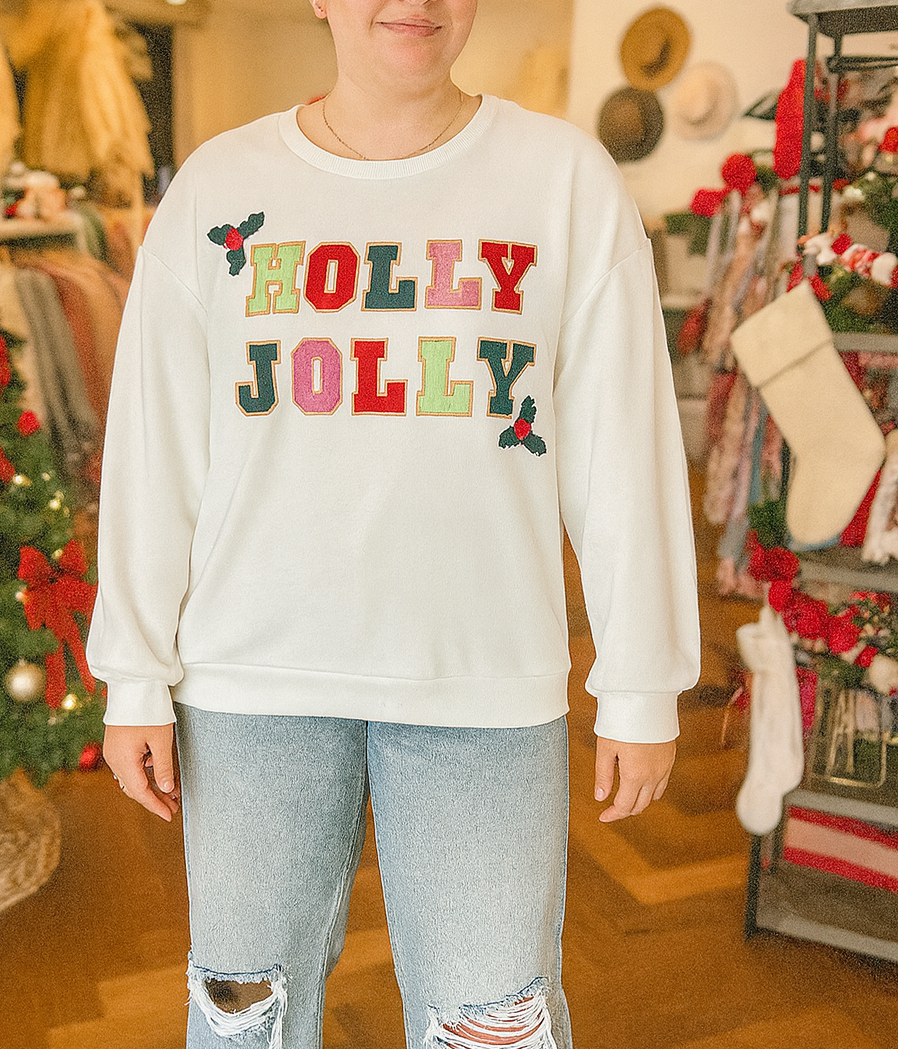 Celebrate the season with the Holly Jolly Embroidered Pullover. Its crisp white color perfectly captures the snowy vibe of winter, while the festive embroidery adds a cheerful holiday touch. Featuring a casual drop shoulder and classic round neck, this sweatshirt offers a relaxed fit that's comfortable for all-day wear. Ideal for spreading Christmas cheer in style, it pairs easily with any outfit for a cozy, seasonal look.