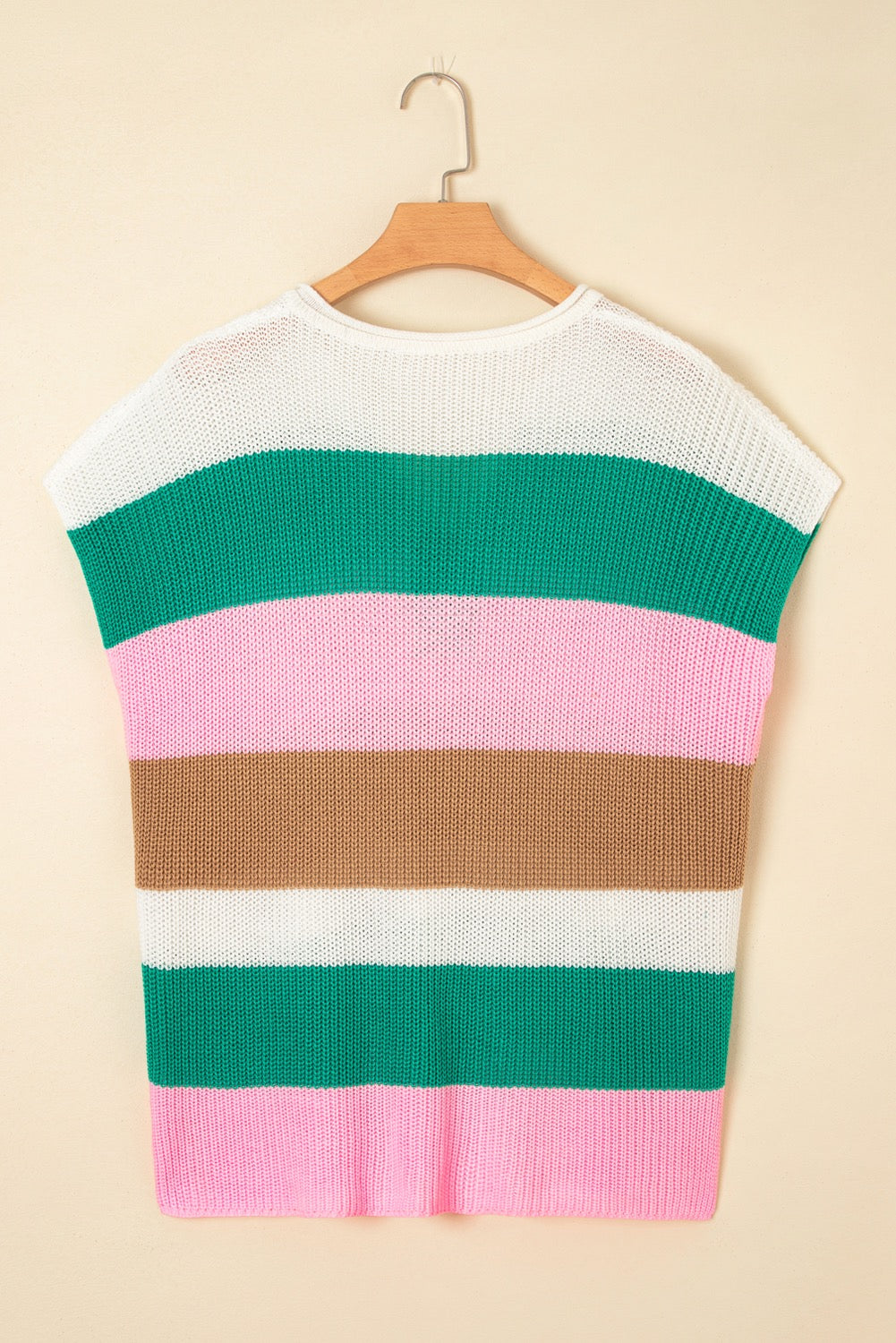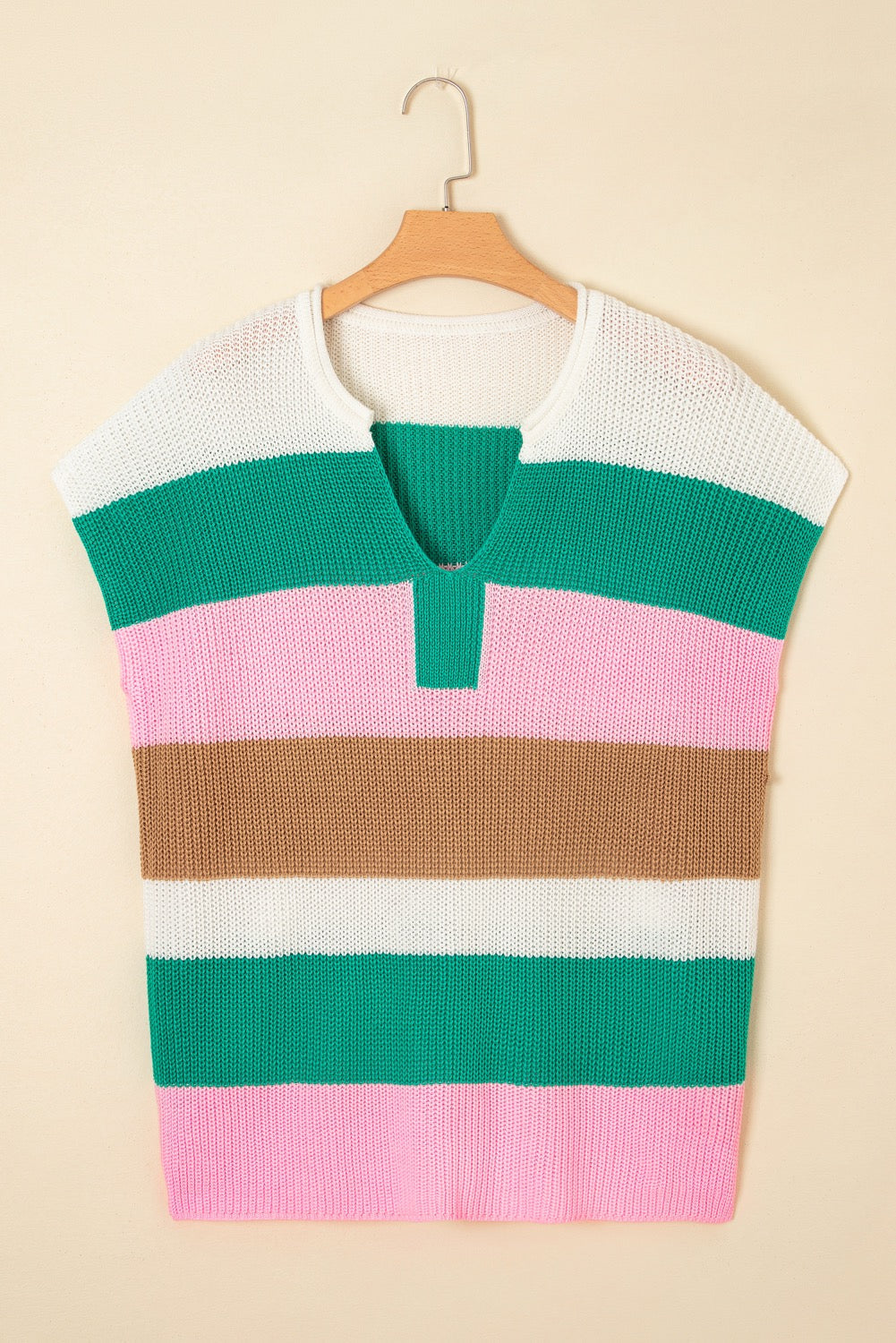 Elevate your wardrobe with our Knit Plus Size Striped Top. Made from cozy knit sweater material, this trendy top features a notched v neck and short sleeves, perfect for any occasion. In green, pink, and white, it's a must-have addition to your wardrobe.