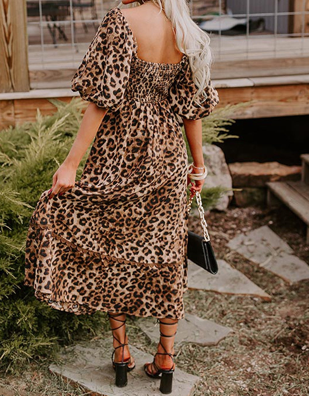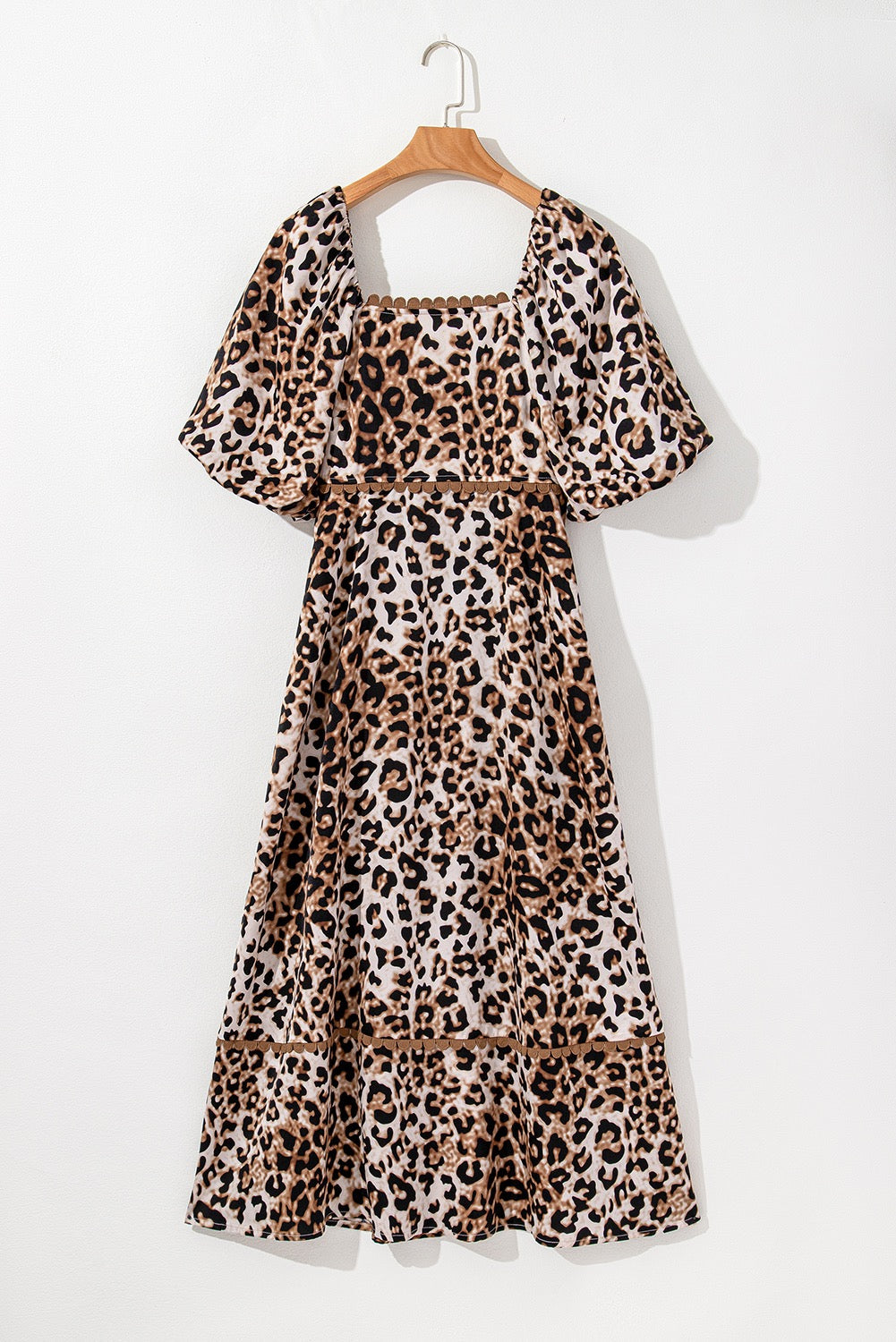 This Brown Leopard Maxi Dress features beautiful brown lace details adorning a stunning dark classic leopard print. The bubble sleeves and square neck add a touch of elegance. Perfect for any occasion, this dress is sure to make you stand out and feel confident.