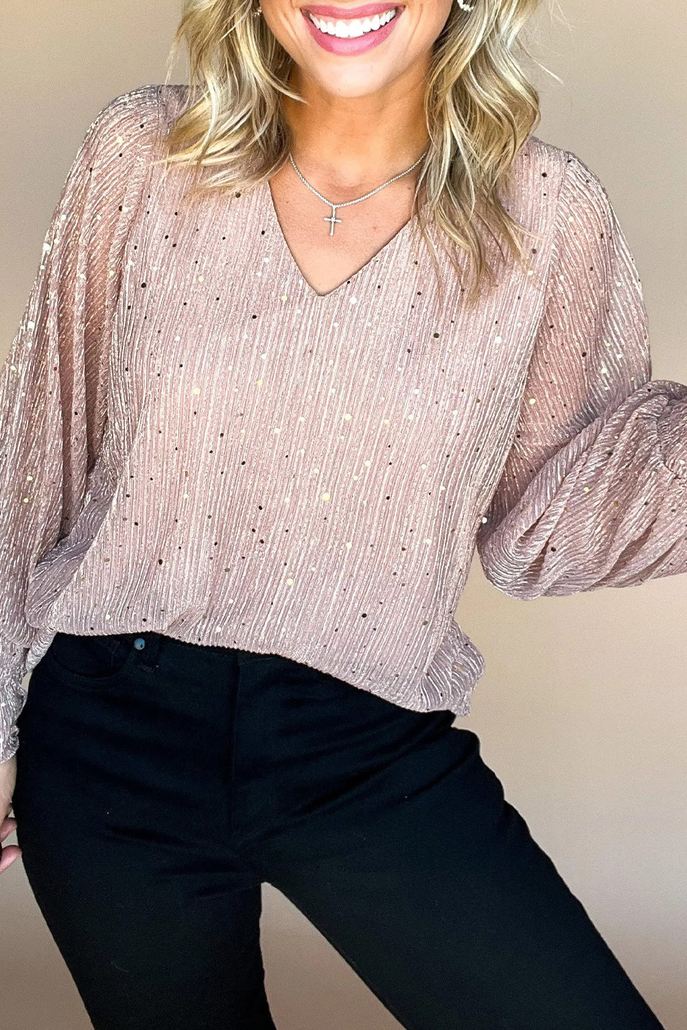 Elevate your party look with this Light Pink Sequin Blouse. Featuring a chic plisse texture and metallic shimmer, it drapes beautifully for an elegant silhouette. The flattering V-neck highlights your neckline, while long sleeves ensure style and comfort for fall events and nights out. Perfect for adding sparkle to any occasion.