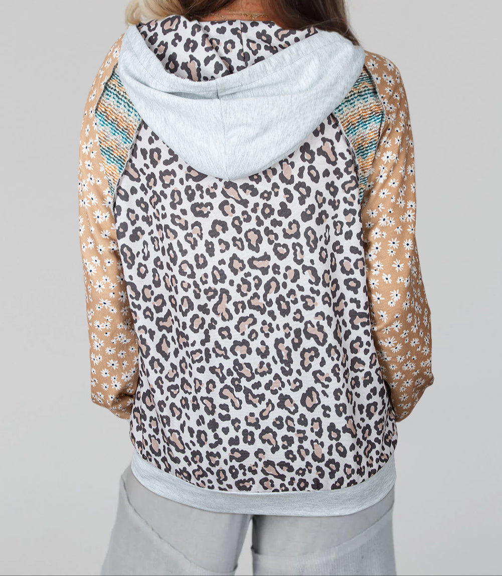 This casual hoodie showcases a unique triple-pattern patchwork design, combining leopard panels, floral sleeves, and multi-striped patches for a standout look. The adjustable drawstring hood ensures a comfortable, personalized fit. Ideal for pairing with jeans, joggers, or sweatpants, it’s a versatile addition to your casual wardrobe.
