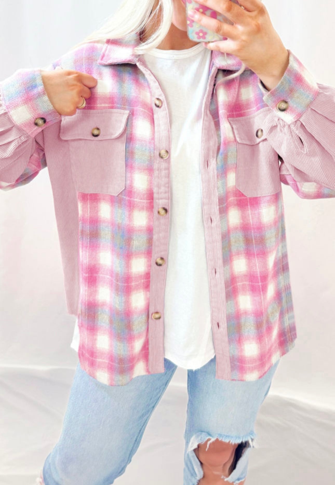 Introducing the Pink Plaid Corduroy Shacket FB - the ultimate combination of style and comfort. The brushed plaid fabric adds a cozy texture and timeless fall aesthetic, while the corduroy patchwork detailing adds a retro-inspired charm and warmth. Plus, with functional flap pockets, practical storage has never looked so stylish. Don't miss out on this must-have shacket!
