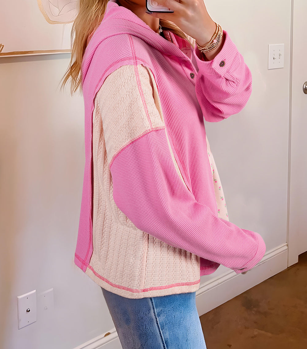 This Pink Waffle Patchwork Hoodie LT combines textured fabrics in a unique patchwork design that adds visual interest. Its soft pink hue and delicate floral pattern create a feminine look, while the oversized fit flatters every body shape and offers a slimming effect. Perfect for a stylish, comfortable statement piece.