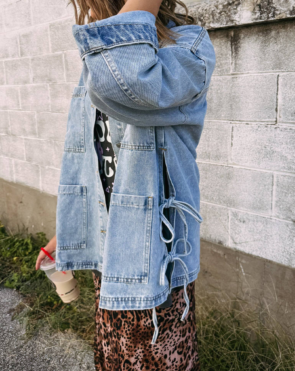 Elevate your casual wardrobe with the Side Tie Boyfriend Jacket FB. This light wash denim jacket features practical front pockets and a distinctive side tie-up detail, adding a fresh twist to a classic design. Its relaxed boyfriend fit provides effortless style and comfort, making it the perfect layering piece for any outfit.
