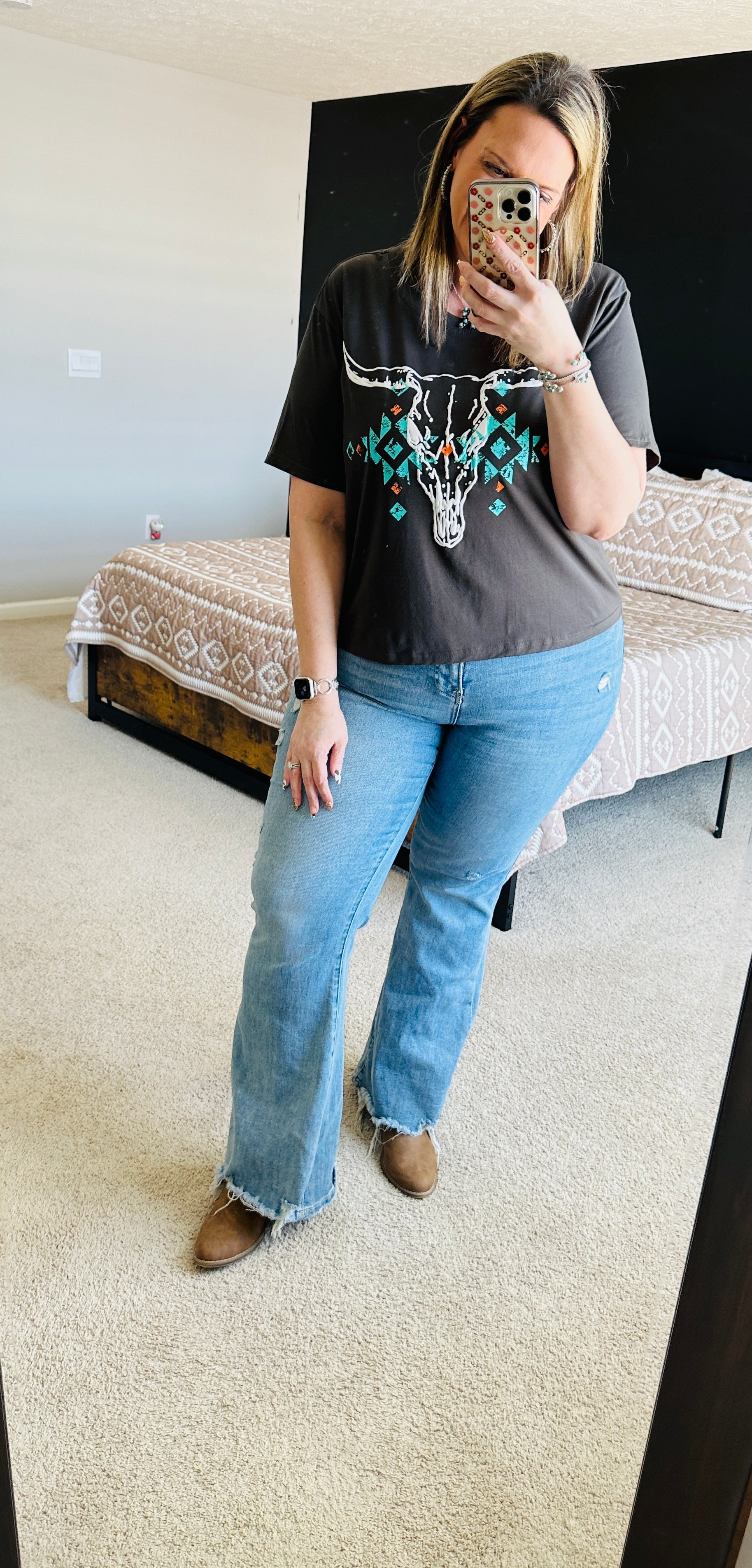 This graphic top is a legit throwback look influenced by the wild west. Boasts a fierce steer skull and turquoise Aztec design on the front. Made with top-notch materials for ultimate coziness. Ideal for spicing up your fashion game with a standout twist.