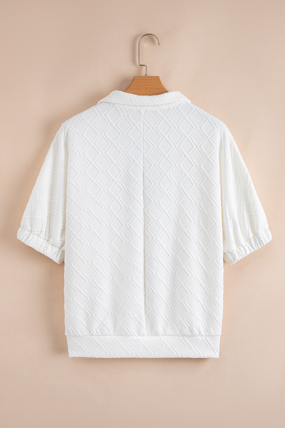 Elevate your style with our Striped Zip Collar Blouse. Crafted from a white textured material, this blouse features a v neck and bubble sleeves for a feminine touch. The green and pink contrasting stripes on the zip up collar add a pop of color, making this blouse a must-have for any wardrobe.