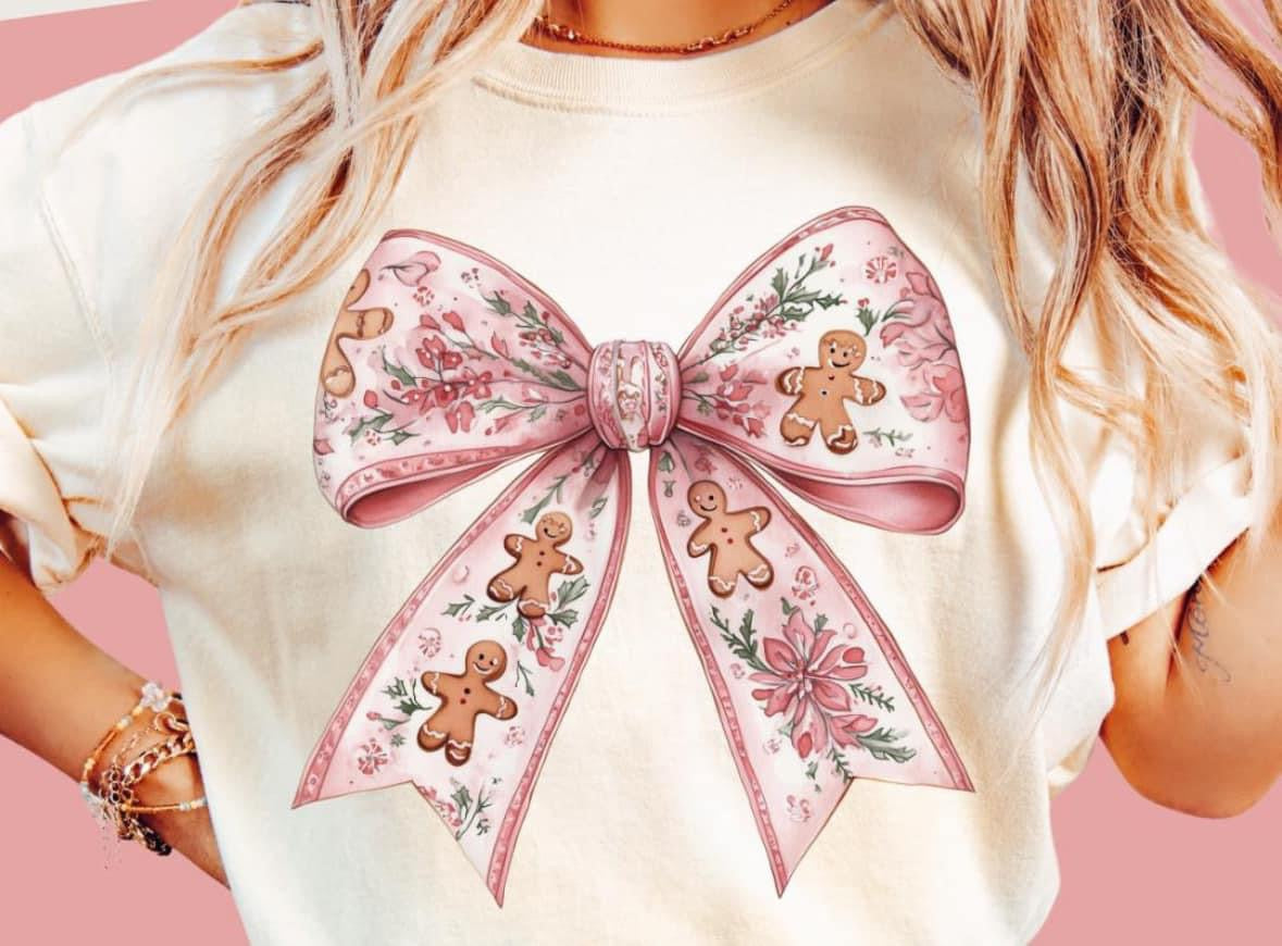 Vintage gingerbread pink bow design tee / sweatshirt l